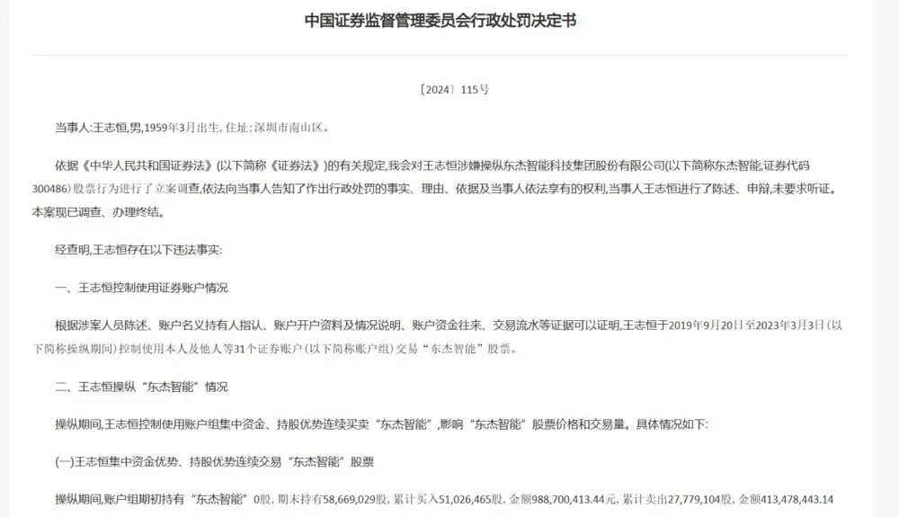 王志恒的上述算作,被证监会认定为“主管证券市集”,责令王志恒照章搞定坐法握有的“东杰智能”,并处以200万元罚金。